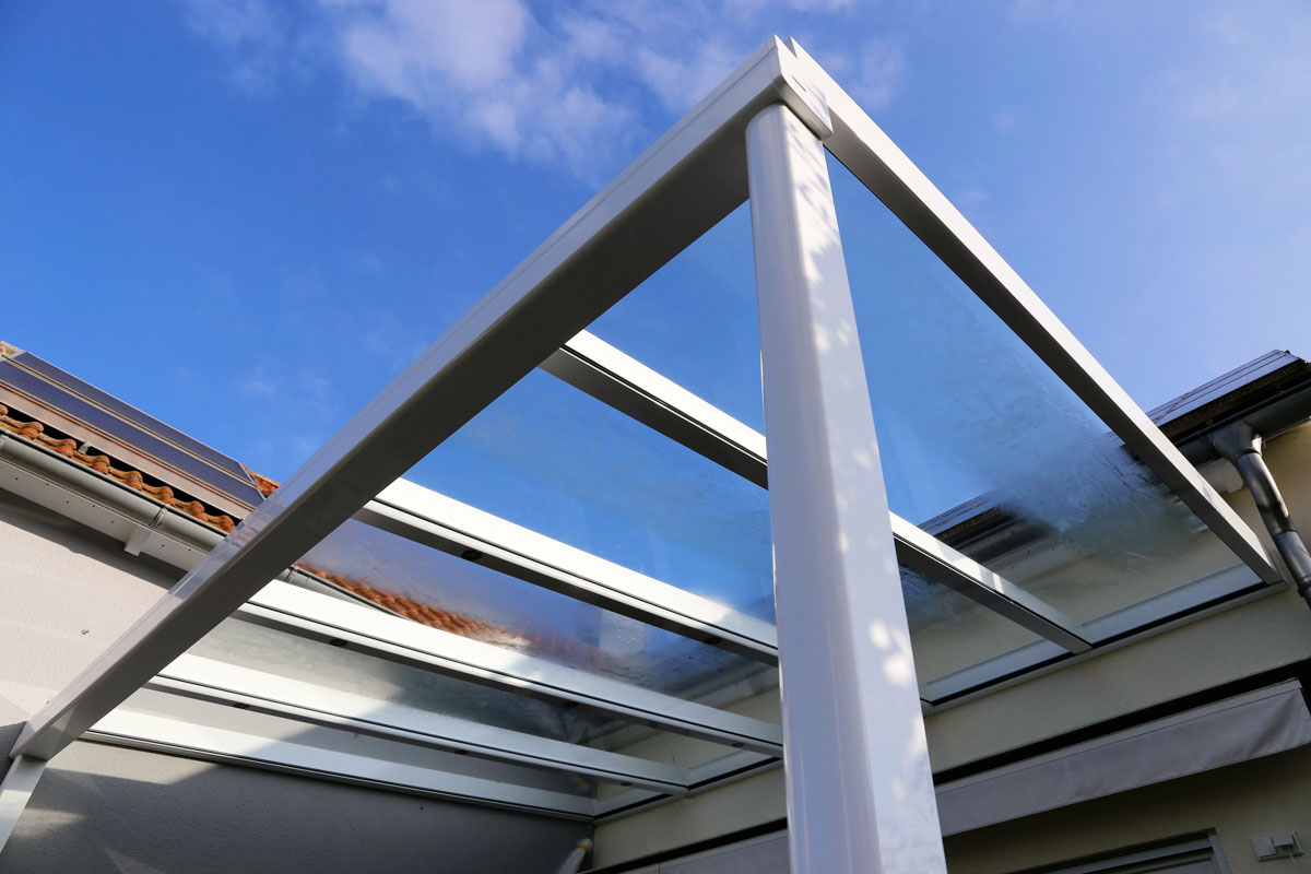 Ob als Überdachung für die Terrasse oder als Regenschutz im Wartebereich, eine Überdachung aus Metall bietet eine hohe Langlebigkeit und kommt im Vergleich zum Holz deutlich kleineren Profilquerschnitten aus. Somit ist entweder eine größere Überbauung von Flächen ohne Stütze möglich, oder bei gleicher Anzahl an Stützen kann die Profilgröße gesenkt werden.